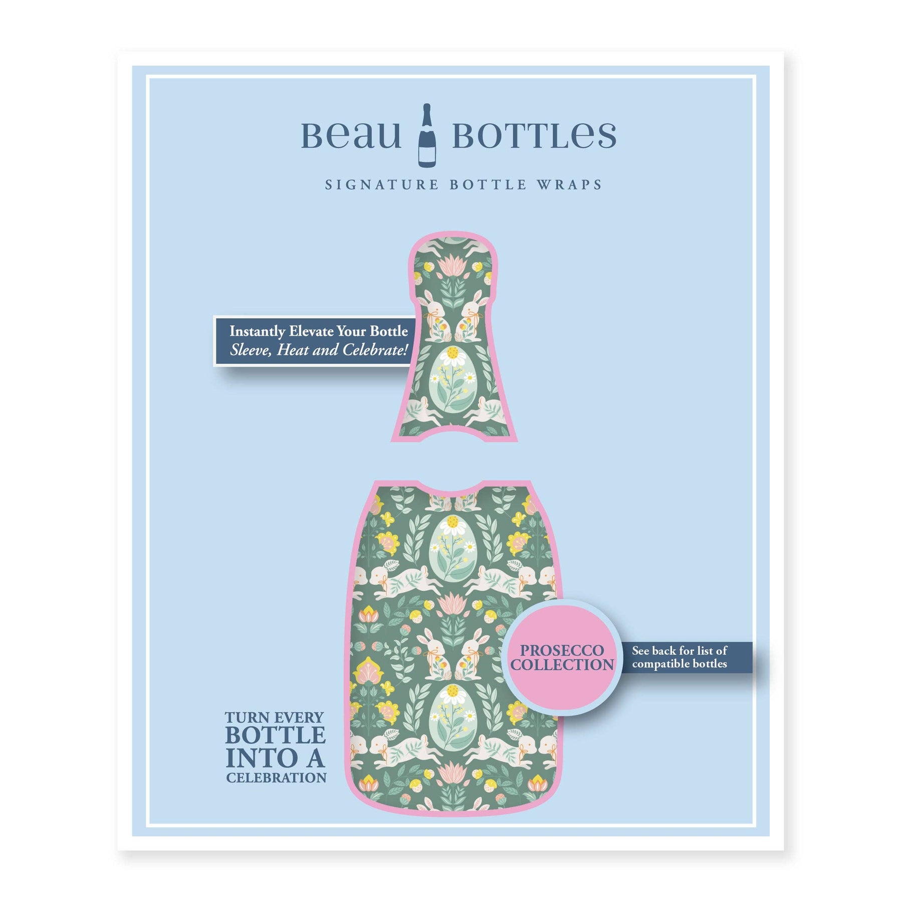 Dress up your bubbly with our whimsical Beau Bottles wrap featuring charming spring folk bunnies. Perfect for gifts or celebrations, this Prosecco-ready design brings instant personality to your La Marca 750ml bottle. Just slide it on, use a hairdryer or warm water to activate the shrink-to-fit magic, and watch it transform into a polished, picture-perfect present. It's the easiest way to make your bottle the star of the show.