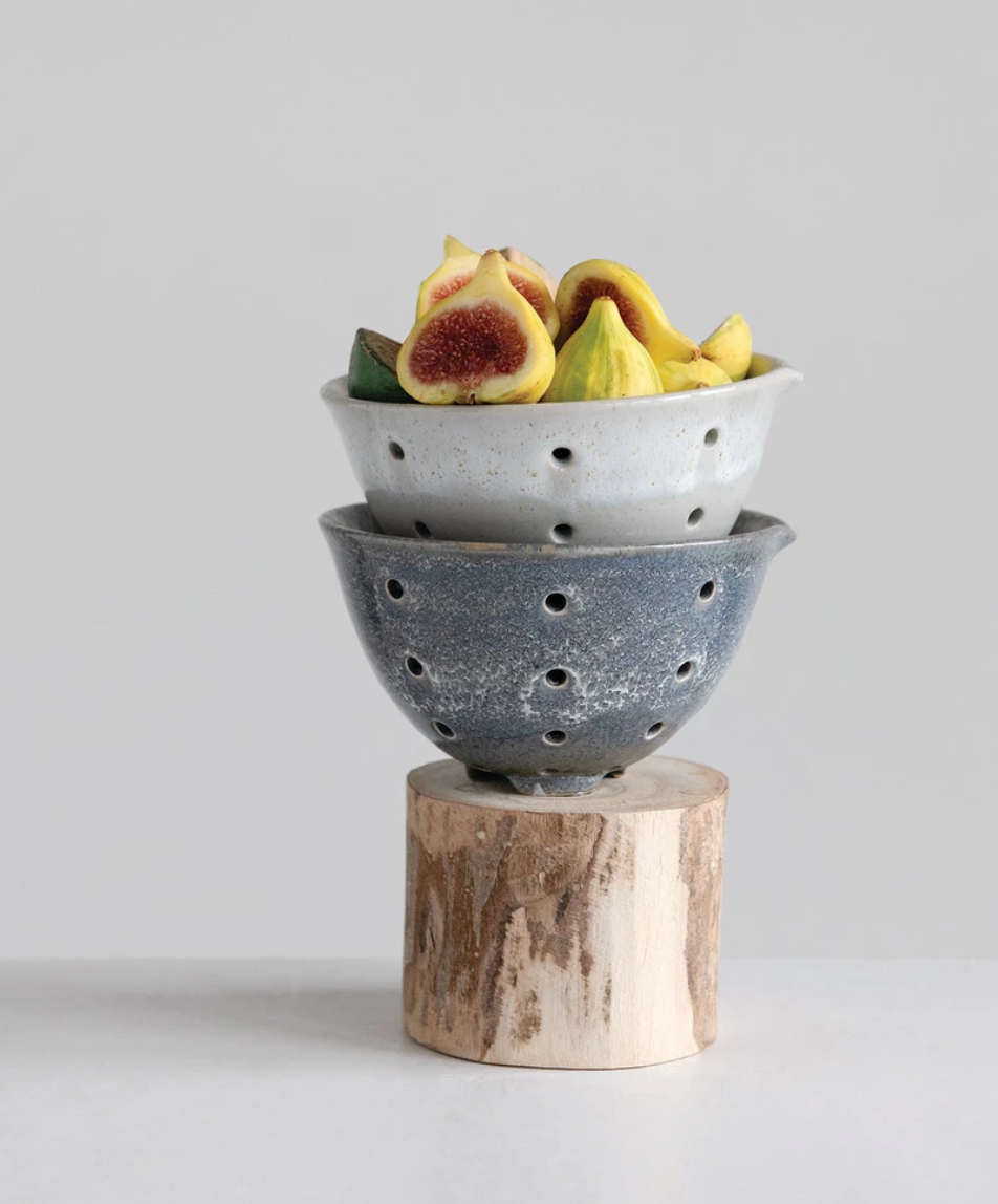 These charming stoneware berry bowls bring rustic flair to your table while keeping fresh fruit front and center. Perfect for strawberries, blueberries, grapes, or raspberries, they're equally at home as a snack station or table centerpiece. Each handcrafted piece features a reactive glaze with natural color variations—no two are exactly alike. Available in 2 distinct colorways. Measures 6" round x 3-1/2"H.