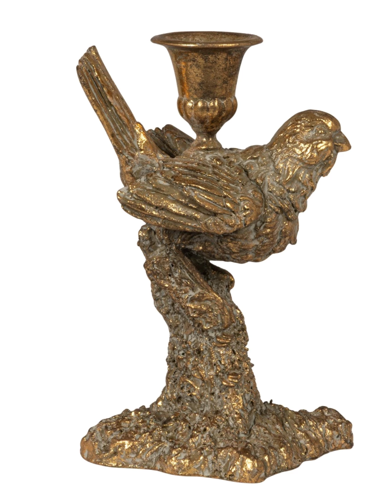 Perch your taper candles on this whimsical resin bird—a charming vintage-inspired accent that brings nostalgic elegance to any tablescape. Measuring 4-1/2"L x 3"W x 6-1/2"H with a beautifully distressed antique gold finish, this delightful holder pairs timeless style with a touch of nature-inspired whimsy.