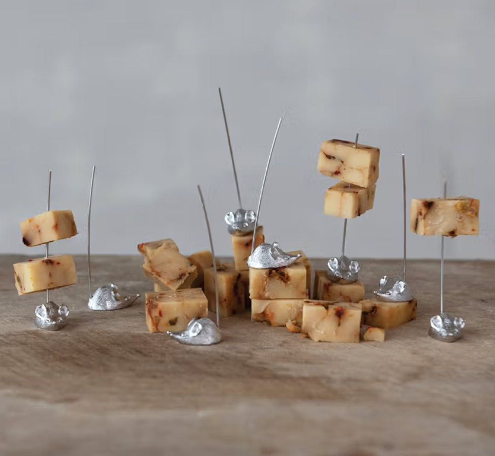 A delightful set of eight charming cheese picks featuring whimsical mouse-topped handles in gleaming silver. Each pick stands 2¾" tall and crafted from durable zinc alloy with authentic vintage styling. Perfect for entertaining, charcuterie boards, or as a thoughtful gift for the cheese lover in your life. Comes beautifully boxed and ready to impress.