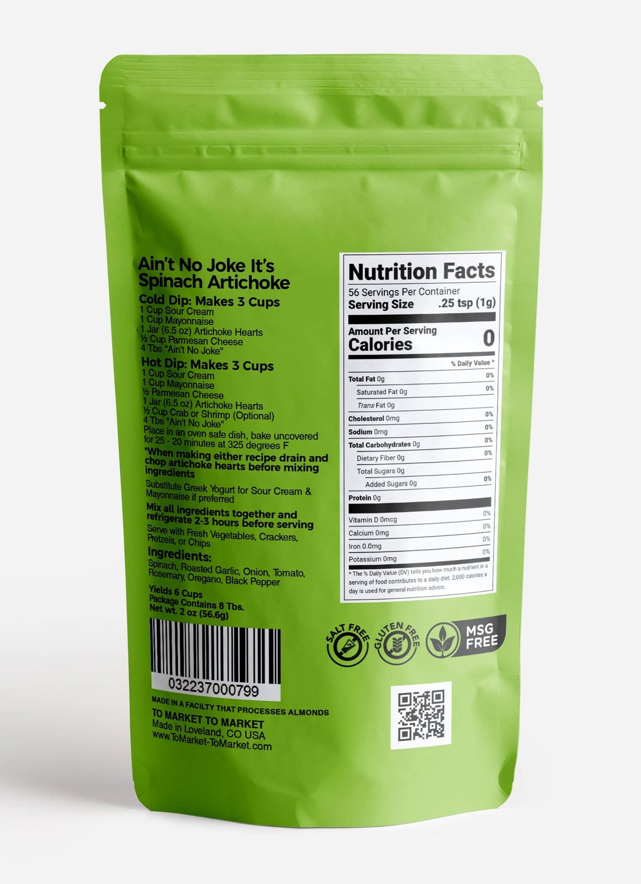 Sensational Spinach & Artichoke Dip! For all the spinach and garlic lovers, this is a must have! Make it up as a cold or hot dip. INGREDIENTS: Spinach, Roasted Garlic, Onion, Tomato, Rosemary, Oregano and Black Pepper No MSG, No Chemicals, No Preservatives, No Salt, Gluten Free.