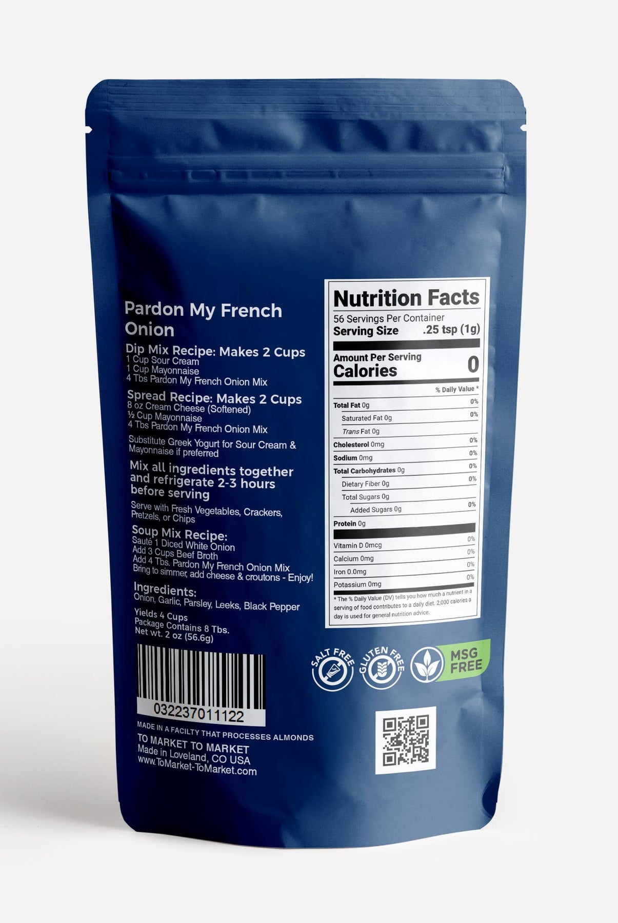 Pardon My French! This versatile onion blend is a flavor powerhouse for the French onion fanatic. Whip up a creamy dip, savory spread, or bubbling hot dip in minutes—this mix does it all. Crafted from real onion, garlic, parsley, leeks, and black pepper, it's gluten-free, salt-free, and naturally delicious with zero MSG. One 2oz packet makes up to 4 cups of dip. Simply combine with sour cream, mayo, or cream cheese and you're ready to impress. Oui, oui!