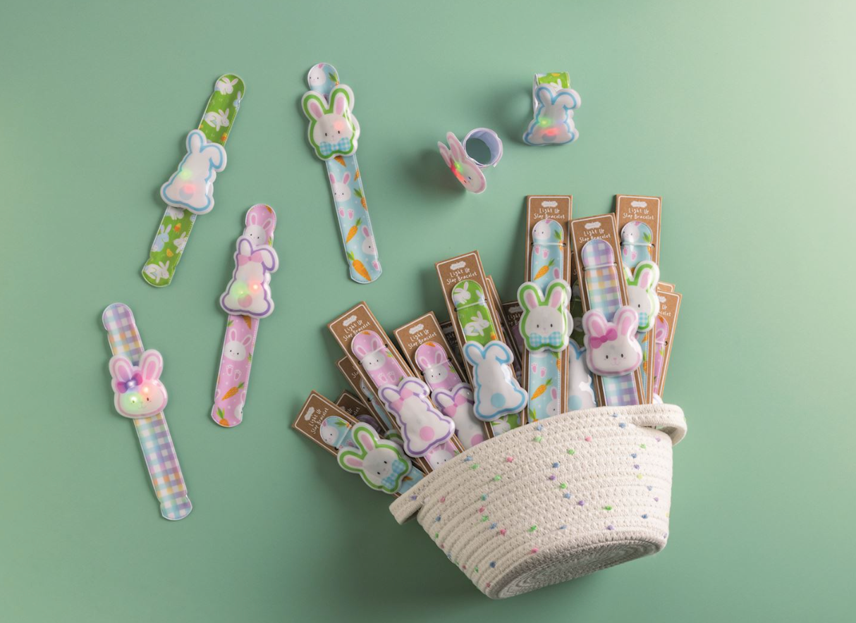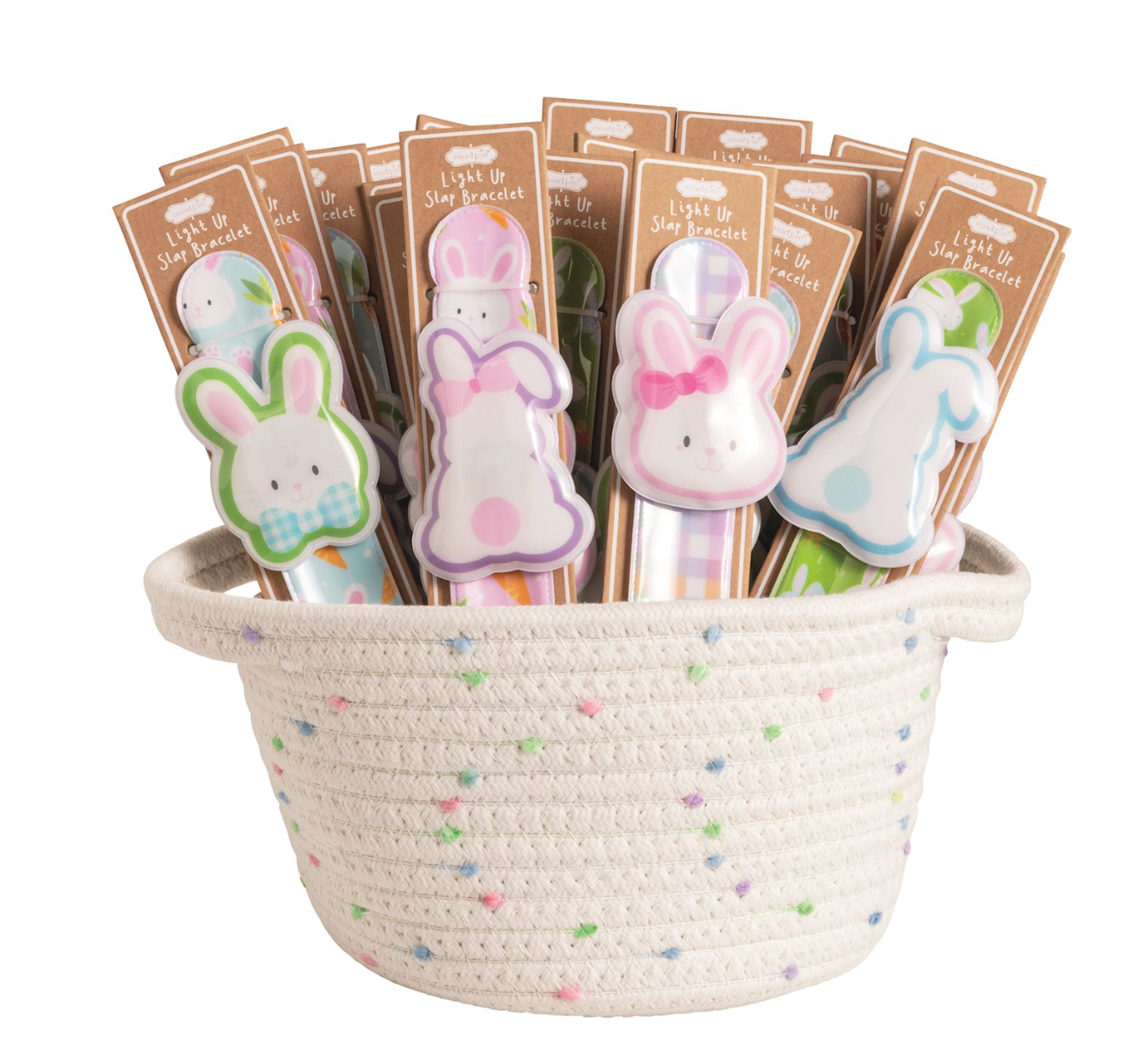 Patterned slap bracelet with LED light-up character. Comes on display card in cotton rope display basket. Ages 3+.
