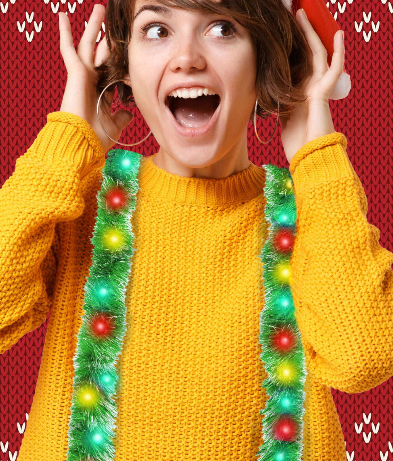 Make a bold statement this holiday season with Uncle Bob's gloriously gaudy suspenders. These functional accessories combine practical design—adjustable straps and reliable metal clips keep everything secure—with pure festive fun. The built-in LED lights deliver three electrifying flash patterns, controlled by a convenient button for instant mode switching. Whether you're embracing ugly sweater party culture, assembling a holiday costume, or simply celebrating maximum tackiness, these suspenders deliver laughs and luminescence in equal measure.