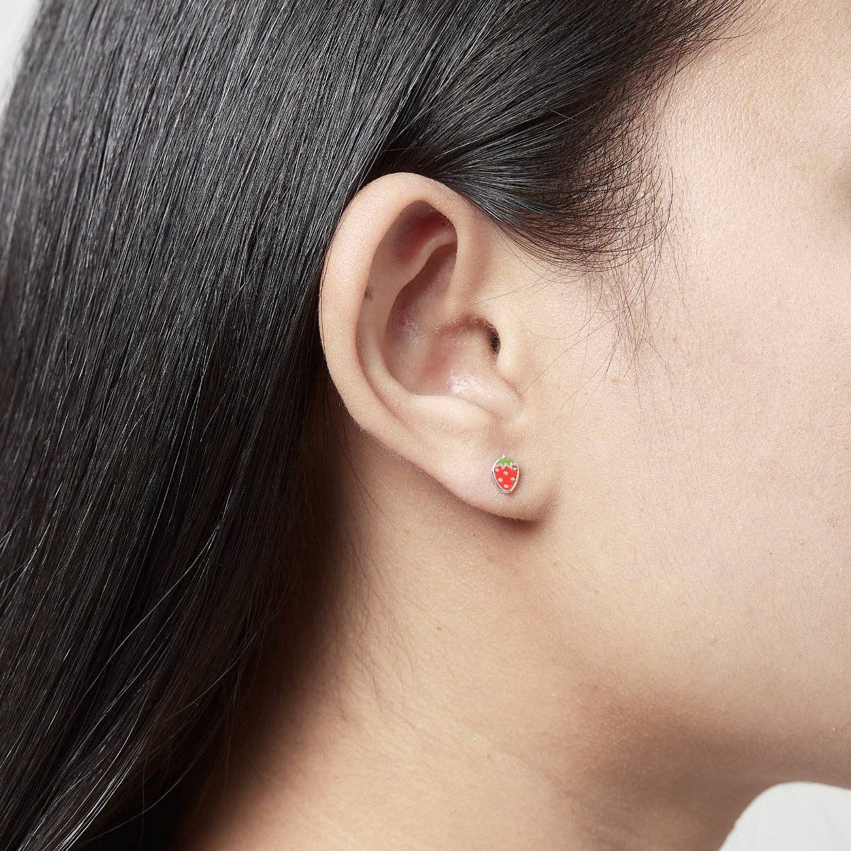 Adorable strawberry studs crafted from 100% recycled Sterling Silver with hand-painted details using EU-certified, nontoxic paints. These petite beauties are nickel-free, lead-free, and hypoallergenic—perfect for sensitive ears. Each pair features the Boma 925 hallmark on the posts and boasts antimicrobial properties. Measuring just 1/4" tall, they're the ideal everyday accessory with a sweet, fruity charm.