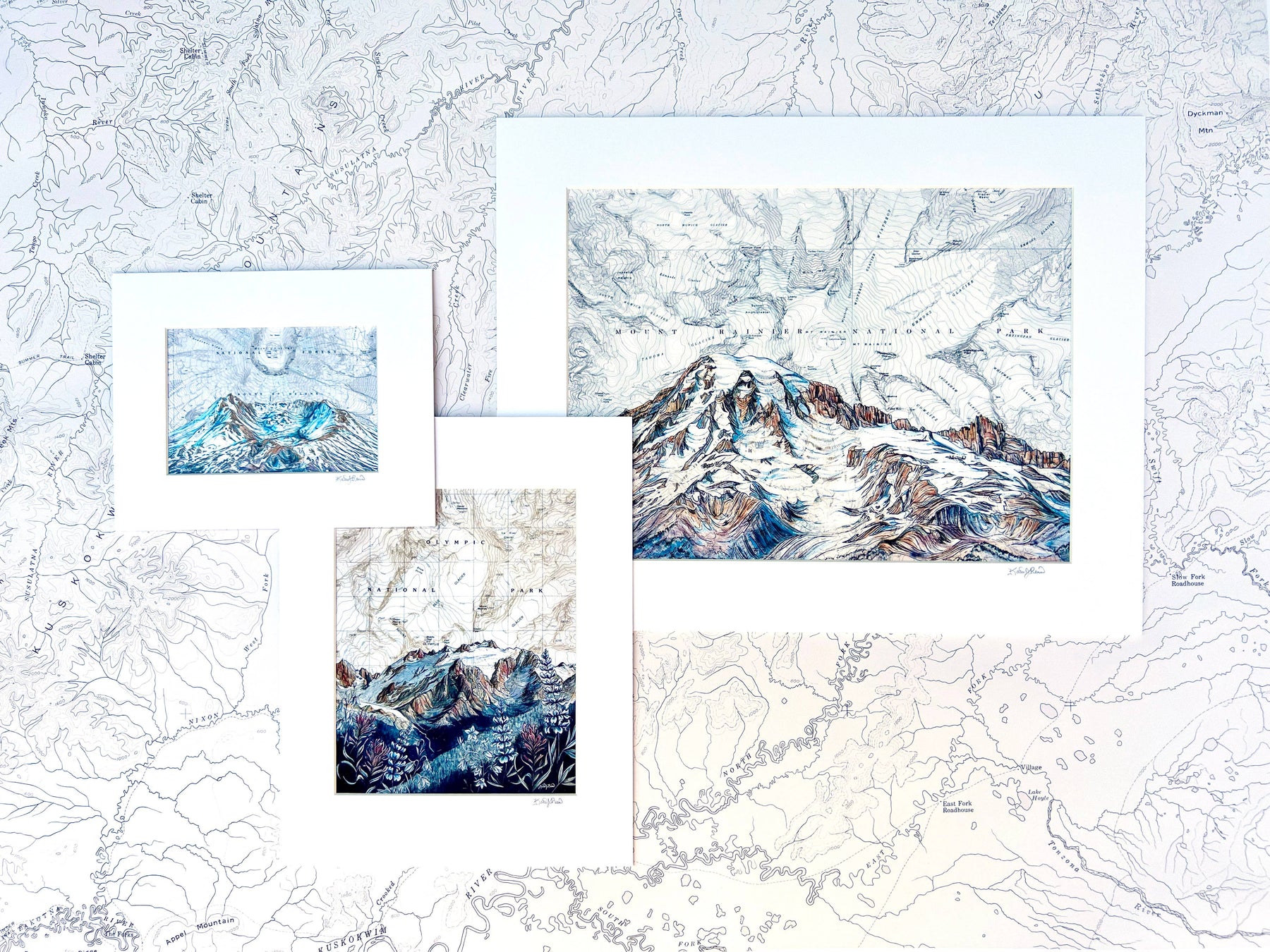 My original North Cascades National Park painting on a vintage topography map is available as an archival print in a variety of options. Wildflowers frame epic mountain peaks of this gorgeous Washington wilderness. Matted prints are quality matte archival prints and come signed with cardboard backing in a protective plastic sleeve. Mat sizes are easy to find standard frame sizes. SM- 5x7” print in 8x10” mat (some cropping of the image occurs to fit this size)